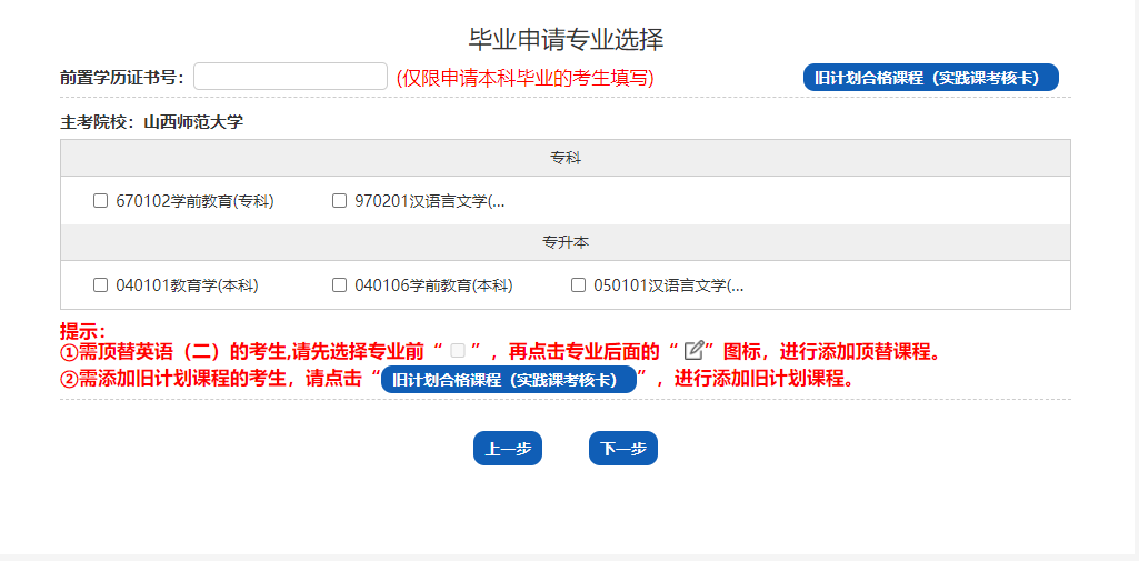 提示:需顶替英语(二)的考生,请先选择专业前“□”,再点击专业后面的“ ”图标,进行添加顶替课程。需添加旧计划课程的考生,请点击“旧计划合格课程(实践课考核卡)”,进行添加旧计划课程。